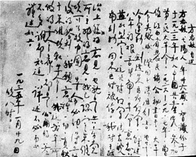 1935年2月底,国民党江西省党部一个执委偕江西《民国日报》记者来访。当记者问到是否向狱方提出“假以时间,俾写自传”时,方说“拟定数万言,唯以心绪不宁,迄未成就”。