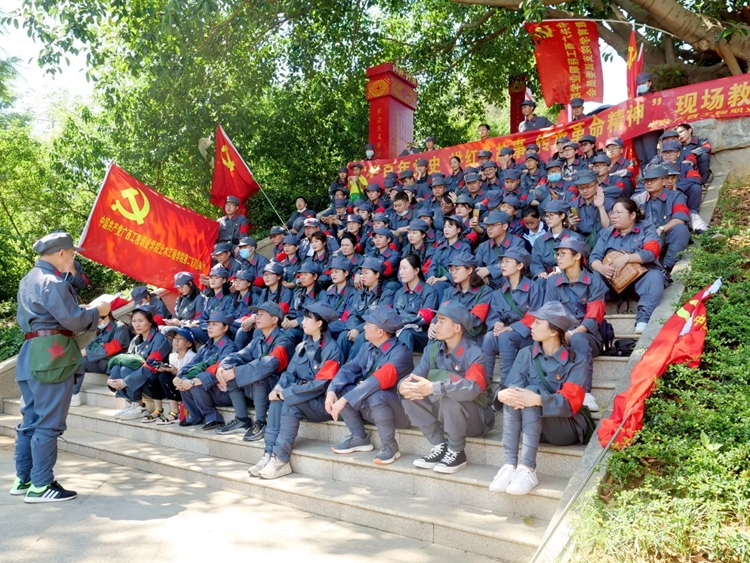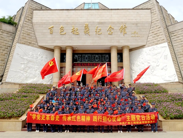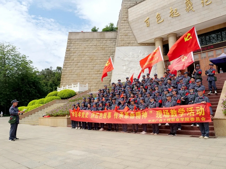 最后一站来到百色起义纪念馆,在百色起义纪念馆大门阶梯上,全体党员身着红军装,整齐肃立,再次聆听学校党委副书记、副校长胡细木为大家讲述“百色起义历史及红色故事”。随后,集体参观学习了百色起义历史展馆厅、英烈厅等展厅。一个一个的红色革命故事,一件一件的红色革命文物,洗涤和净化了我们内心深处的灵魂,更加坚定了我们在新时代赓续红色血脉、传承红色精神的理想信念。