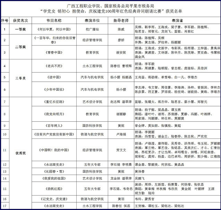 经过激烈比拼,校广播站吴桐等同学带来的《何以华夏,何以中国》荣获一等奖,经管学院陈植辉等同学带来的《一百年华,归来的你依旧青春》、教育学院王海戎等同学朗诵的《青春中国》荣获二等奖,土木工程学院李军毅等同学带来的《老兵不死》、汽车与机电学院王尚鉴等同学朗诵的《读中国》及李志涛等同学的《少年中国说》荣获三等奖,艺术设计学院蓝敏等同学带来的诗歌朗诵《重忆长征路》等11个作品荣获优秀奖。