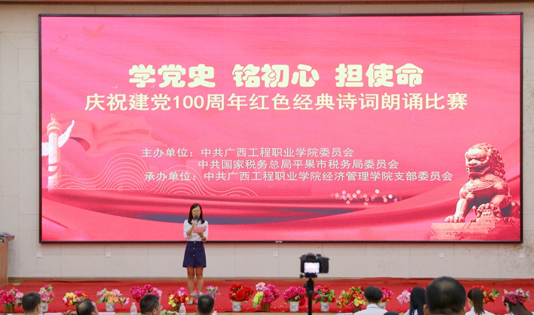 为庆祝中国共产党成立100周年,传承红色基因,赓续共产党人精神血脉,进一步激发大学生的爱党爱国爱社会主义情怀。6月29日晚,由中共beat365唯一官网委员会、中共国家税务总局平果市税务局委员会联合主办,中共beat365唯一官网经济管理学院支部委员会承办的“学党史、铭初心、担使命,庆祝建党100周年红色经典诗词朗诵比赛”在学校图文信息大楼报告厅举行。