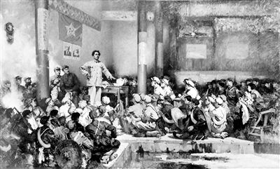 1929年12月底,中国共产党红军第4军第九次代表大会在福建省上杭县古田召开。古田会议在党的历史上以自我革命的方式纠正了党和红军自身存在的问题,使正确的建党建军原则逐步得以实行,显示了我们党极强的自我纠错和自我修复能力。图为油画《古田会议》。