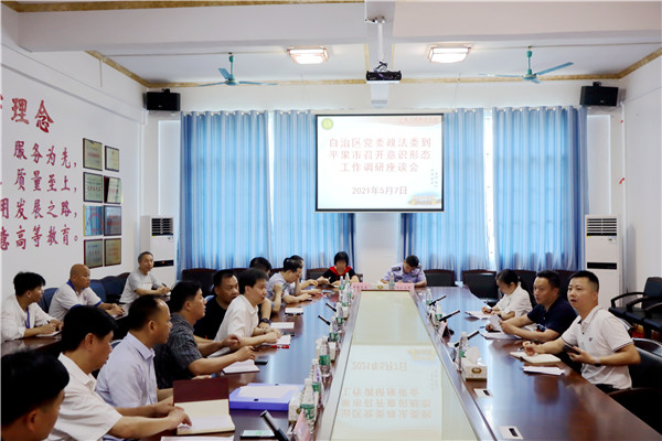 5月7日上午,自治区党委政法委反邪教协调处处长黄河率调研组一行到beat365召开平果市意识形态工作调研座谈会。自治区调研组成员、百色市委政法委、平果市委政法委、市委宣传部、市委统战部民宗局、市公安局、市教育局、大学园区等部门的主要负责同志和beat365唯一官网、广西培贤国际职业学院、广西幼儿师范高等专科学校等高校分管领导出席会议。