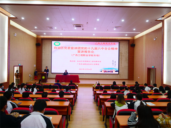 12月16日下午,在学校图文信息大楼一楼学术报告厅,自治区党委教育工委宣讲团成员陈洪涛教授作主题为“党的十九届六中全会精神”宣讲报告。学校党委书记吕伟斌,党委委员、副校长彭高彬、副校长吴先夏,校长助理黄秋霞、覃清香等领导,各部门负责人、各党支部书记、师生党员、学生代表等400多人参加报告会。报告会由吕伟斌主持。