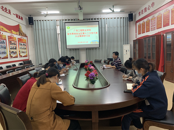 吕伟斌指出,自治区第十二次党代会是在全区与全国同步全面建成小康社会,开启全面建设社会主义现代化广西新征程的大会,是动员全区广大党员、干部群众凝心聚力建设新时代中国特色社会主义壮美广西的大会。大会坚持以习近平新时代中国特色社会主义思想为指导,全面贯彻党的十九大和十九届历次全会精神,深入学习贯彻落实习近平总书记视察广西“4·27”重要讲话精神和对广西工作系列重要指示要求,实事求是回顾和总结自治区第十一次党代表大会以来的工作,客观分析当前的形势和任务、机遇与挑战,科学阐述了为什么建设、建设什么样的和怎样建设新时代中国特色社会主义壮美广西的目标内涵要义,系统谋划我区未来五年和今后一个时期凝心聚力建设新时代中国特色社会主义壮美广西的工作思路、总体要求、奋斗目标、战略任务和重大举措,符合中央精神,切合广西实际,顺应群众期盼。吕伟斌强调指出,要切实提高政治站位,把学习宣传贯彻自治区第十二次党代会精神作为今后一个时期的重要政治任务,掀起党代会精神学习热潮,把握党代会精神的实质内涵,将党代会精神转化为学校建设发展的强大动力,坚决贯彻落实党代会做出的各项决策部署,努力建设特色鲜明高水平的职业院校,以优异成绩迎接党的二十大胜利召开!