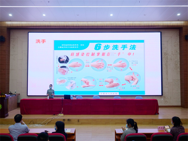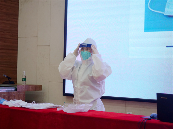 培训会上,专家还就如何科学佩戴口罩、科学穿、脱防护服、科学洗手等内容作了现场演示培训。