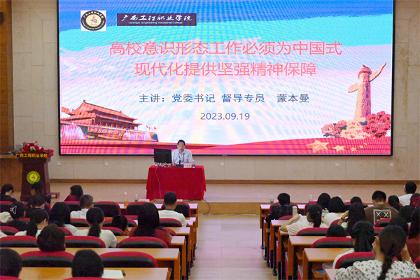 9月19日下午,在图文信息大楼一楼学术报告厅,学校召开中国式现代化暨高校意识形态工作专题报告会,由学校党委书记、督导专员蒙本曼博士作《高校意识形态工作必须为中国式现代化提供坚强精神保障》专题报告。学校副校长蒋茂丽,学校党组织书记、副书记,各部门负责人、行政人员,各专任教师和辅导员等400多人参加会议。会议由党委办副主任黄香琴主持。