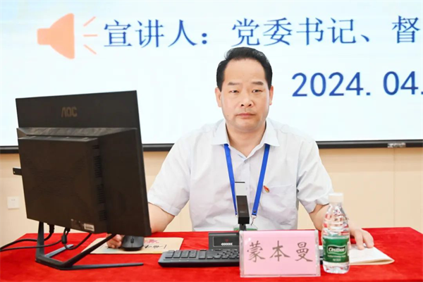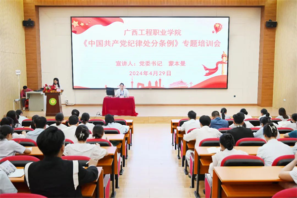 为学习贯彻习近平总书记关于党纪学习教育的重要讲话精神,深入学习《中国共产党纪律处分条例》,引导党员干部自觉做到学纪、知纪、明纪、守纪,4月29日下午,学校党委在图文信息大楼三楼学术报告厅举行《中国共产党纪律处分条例》专题培训会,党委书记、督导专员蒙本曼同志作专题培训,全体党员参加培训,培训会由党委副书记黄秋霞同志主持。