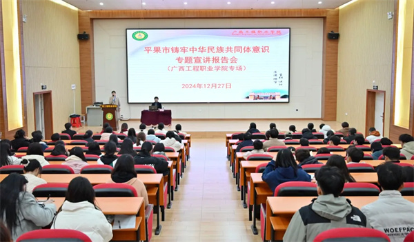 为全面贯彻落实党的二十届三中全会精神,深入学习贯彻习近平总书记关于加强和改进民族工作的重要思想,贯彻落实习近平总书记关于广西工作论述的重要要求,增强铸牢中华民族共同体意识的责任感和使命感,2024年12月27日上午,在图文信息大楼三楼学术报告厅,beat365举办铸牢中华民族共同体意识专题宣讲报告会。学校党员干部、专任教师、辅导员和学生代表等200多人参加宣讲报告会,报告会由党委办公室副主任黄香琴主持。