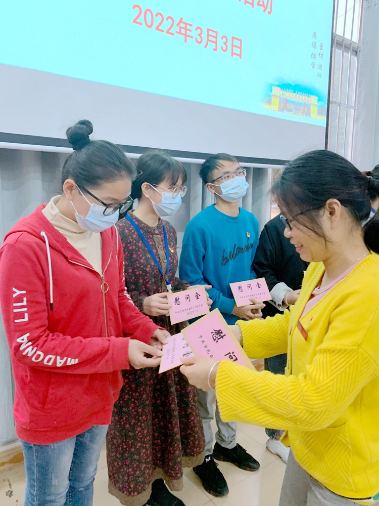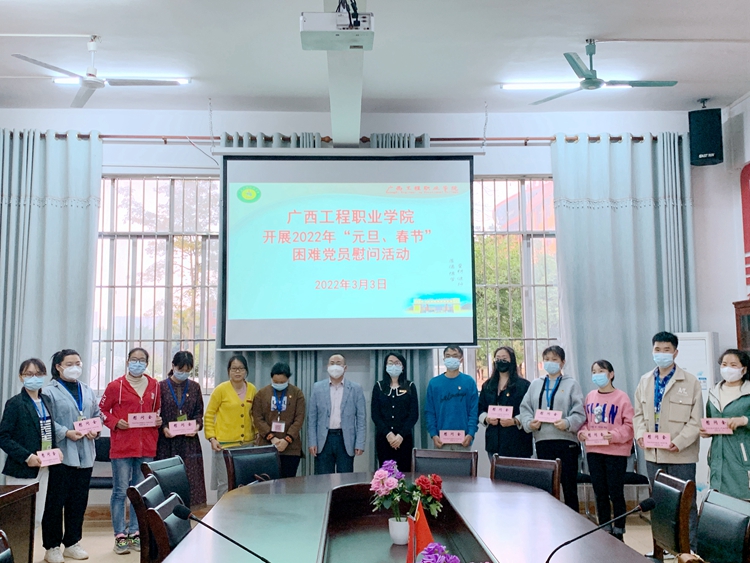 3月3日下午,学校党委在党员活动室开展2022年春节慰问困难党员活动,校党委副书记黄秋霞,纪委书记、副校长彭高彬等同志代表学校党委对10名困难党员进行慰问。