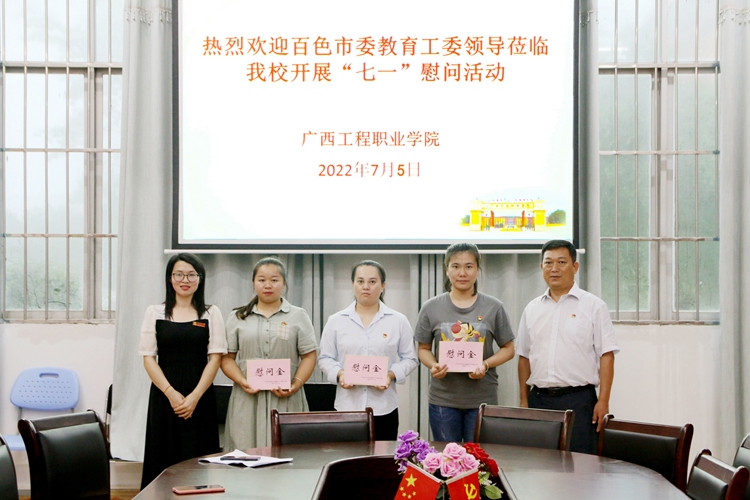 7月5日,百色市委教育工委委员、市教育局党组成员、总督学梁富文莅临beat365开展“七一”走访慰问生活困难党员活动,带来党组织的关怀和节日问候。学校党委副书记黄秋霞陪同慰问。