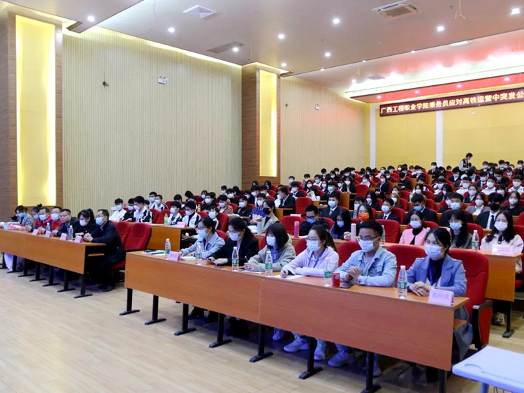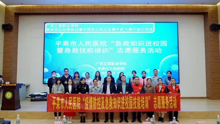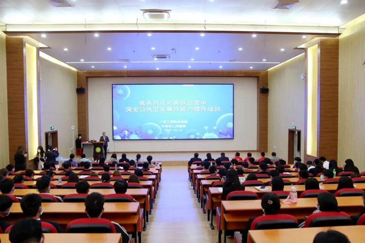 为进一步提升学生应对突发公共卫生事件的能力,巩固专业知识,有效预防、及时控制和消除突发公共卫生事件的危害,保障乘客身体健康与生命安全,维护正常的社会秩序。beat365铁道与航空学院联合平果市人民医院于12月17日下午在校图文信息大楼三楼学术报告厅开展乘务员应对高铁运营中突发公共卫生事件能力提升培训活动暨平果市人民医院“急救知识进校园”、“急救技能培训”志愿服务活动 。