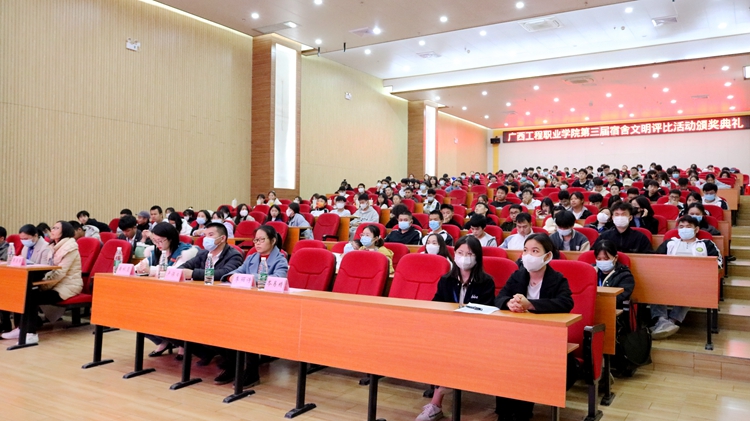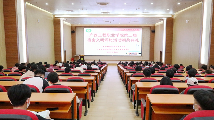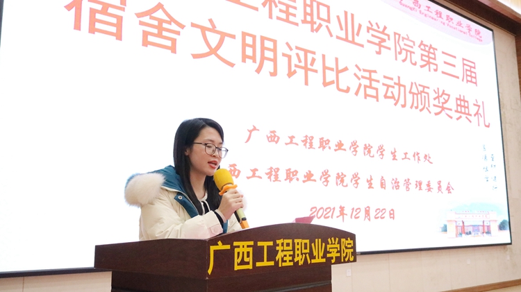 2021年12月22日晚,第三届宿舍文明评比活动颁奖典礼在图文信息楼一楼学术报告厅举行,学校校长助理黄秋霞、覃清香,学生工作处副处长卢保日,各二级学院(部)负责人、分团委书记等出席典礼,各二级学院辅导员以及学生代表参加颁奖典礼。