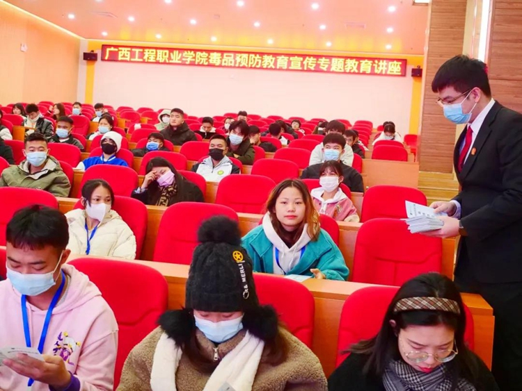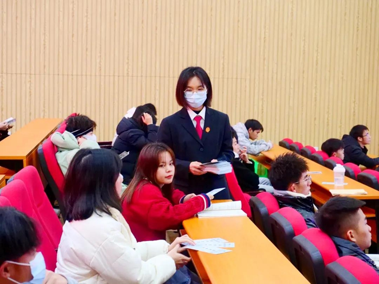 讲座现场,平果市人民法院刑事审判庭的工作人员给同学们分发防诈骗宣传册,让同学们对不法分子的诈骗手段有了进一步的了解,提高了防范意识。