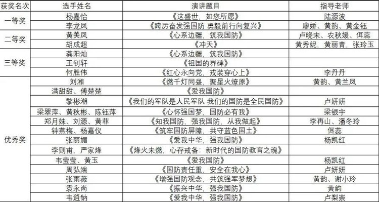经过紧张激烈的角逐,最终,杨嘉怡、李龙凤同学荣获一等奖,黄美凤、胡成超同学荣获二等奖,龚阳灿、王钊轩、何胜伟同学荣获三等奖,刘湘、满甜甜、傅楚楚、黎彬潮、梁翠萍、黄秋彬、陈钰萍等同学获得优秀奖。