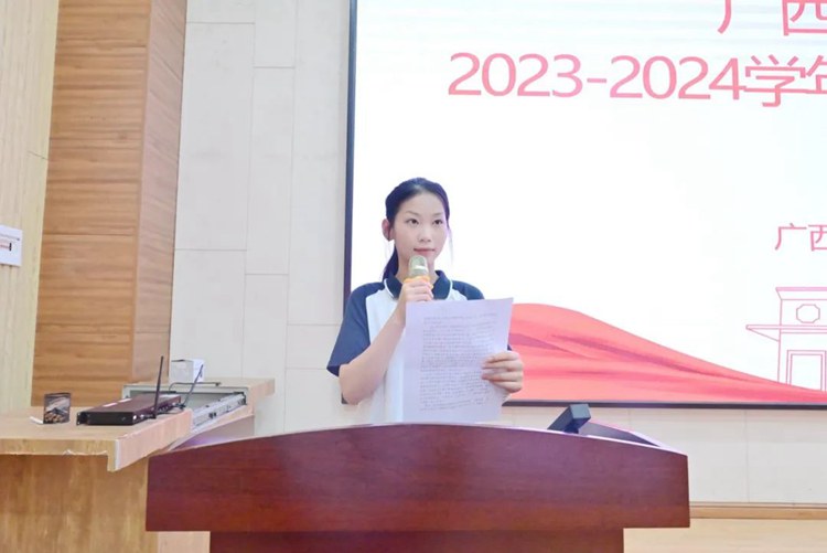 获奖学生代表2023级大数据与会计1班黄翠芬同学发言。她讲述了自己合理规划课余时间,在工作、学习和生活上都取得了优异的成绩的经历,号召全体同学努力学习、全面发展,争做有理想、敢担当、能吃苦、肯奋斗的新时代好青年。