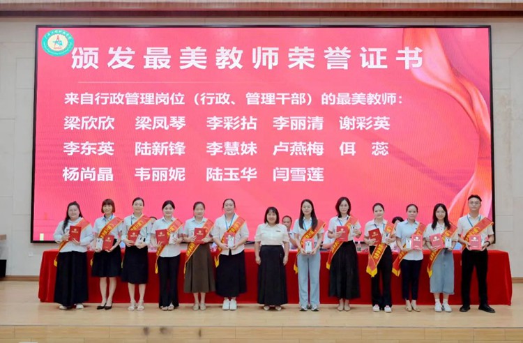 校长罗艳妮为获得“最美教师”荣誉称号的行政管理岗位教师颁奖
