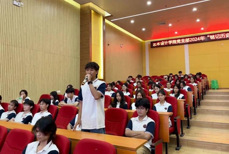 艺术设计学院党支部副书记赵志辉讲话,他指出,今天,我们选择在这个特殊的日子里观看《南京!南京!》,不仅仅是为了铭记历史,更是为了警醒未来。它提醒我们,和平来之不易,必须倍加珍惜;它告诫我们,面对困难和挑战,要勇于担当,敢于斗争;它激励我们,无论时代如何变迁,都要坚守信仰,不忘初心,为实现中华民族伟大复兴的中国梦而努力奋斗。