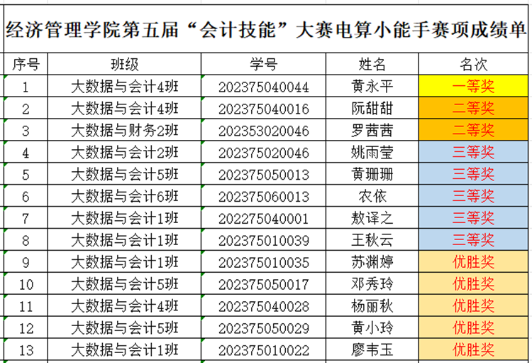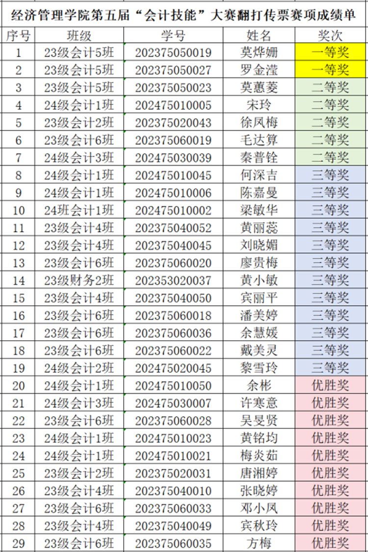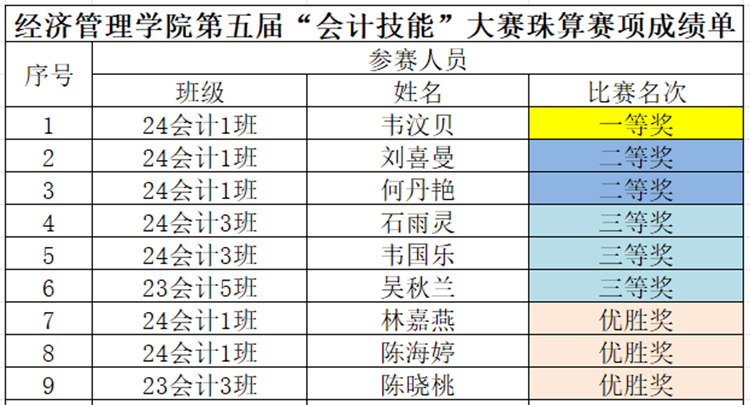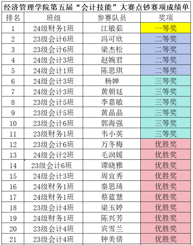 经济管理学院第五届会计技能大赛成绩揭晓,恭喜获奖选手!同学们在四大竞赛单元展现扎实功底,点钞利落、传票飞翻、珠算灵动、电算娴熟,希望大家秉持专业精神,在未来会计学习工作中发光发热 。