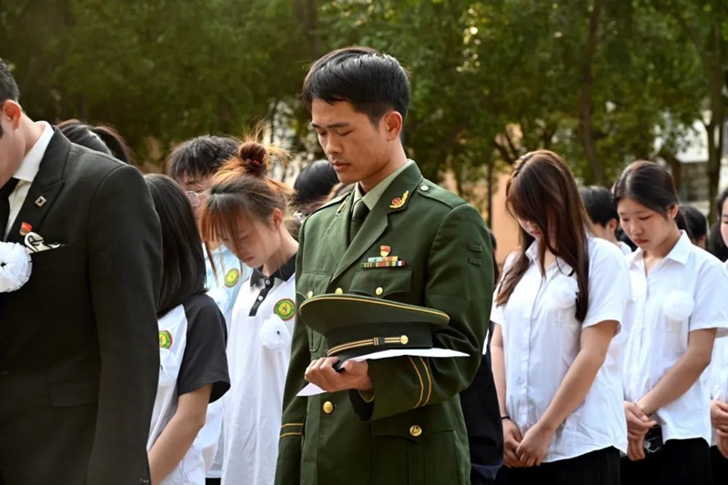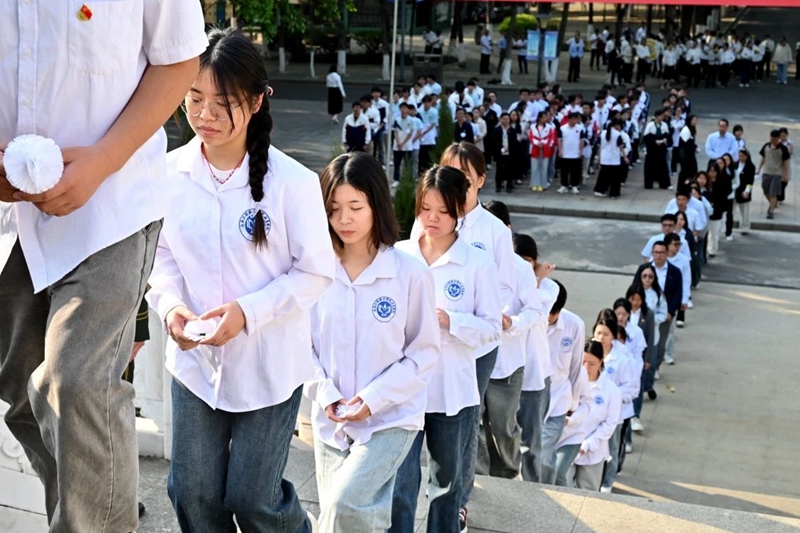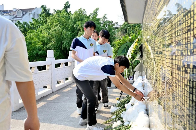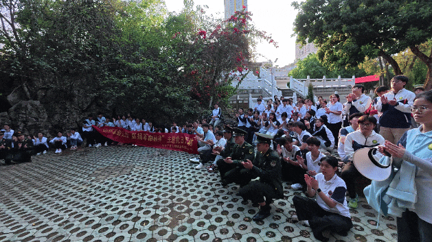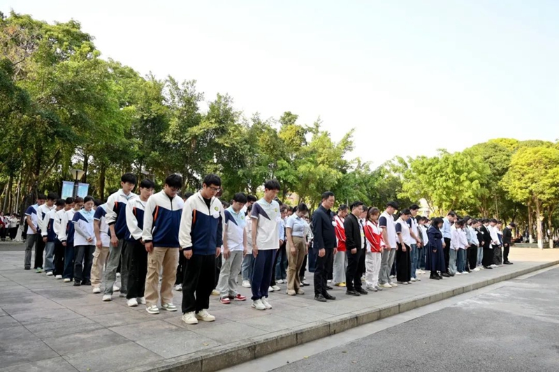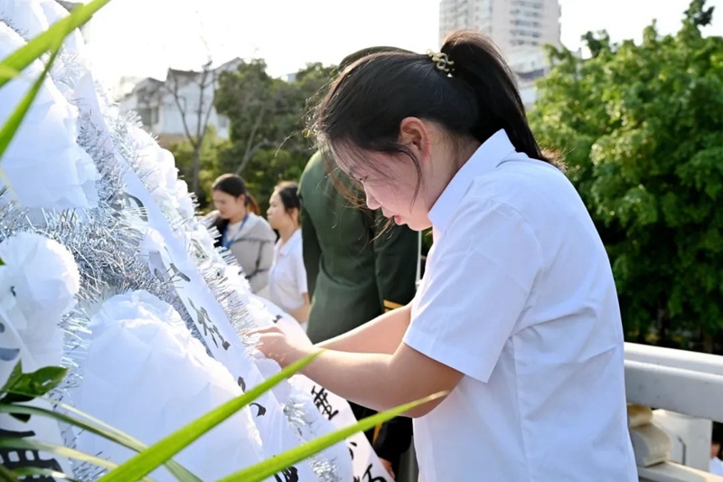 图为全体师生依次走上瞻仰台,向革命先烈敬献小白花