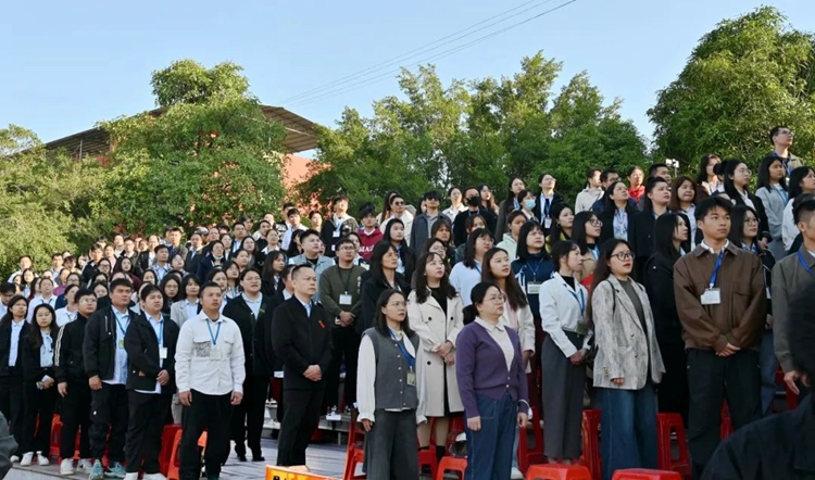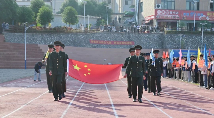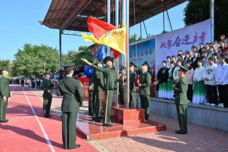 师生们面向国旗行注目礼,鲜艳的五星红旗冉冉升起,点燃了运动健儿们的朝气与热情。
