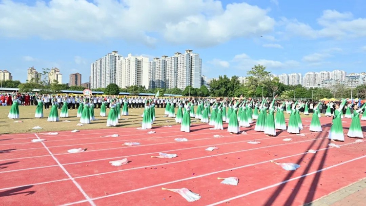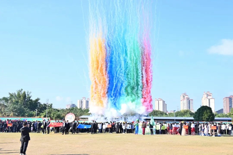 礼炮随即齐响,缤纷的礼花漫天飞扬,现场掌声不断,运动会正式拉开序幕,下面是文艺表演。