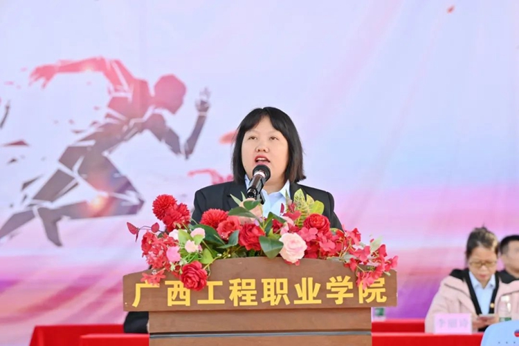 党委副书记、校长罗艳妮致辞。她代表学校向运动会的召开表示热烈的祝贺!向刻苦训练、积极参赛的全体运动员致以亲切的问候!向参与运动会筹备组织工作的全体师生表示崇高的敬意和衷心的感谢!