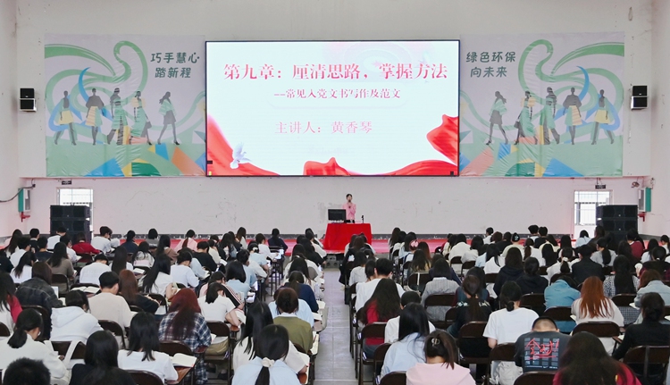 图为党委副书记黄秋霞作题为《明晰条件,向党靠拢》的专题培训
