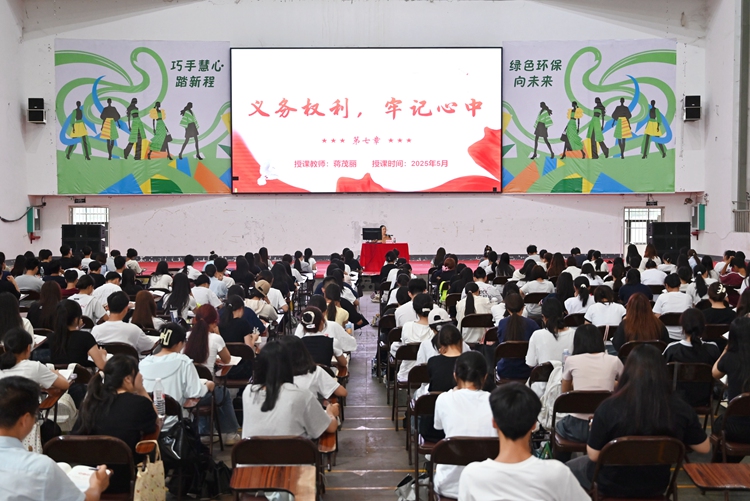 图为组织部部长、副校长蒋茂丽作题为《义务权利,牢记心中》的专题培训