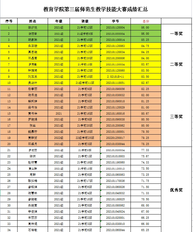 beat365唯一官网2021级、2022级学前教育专业师范生教学技能大赛获奖名单