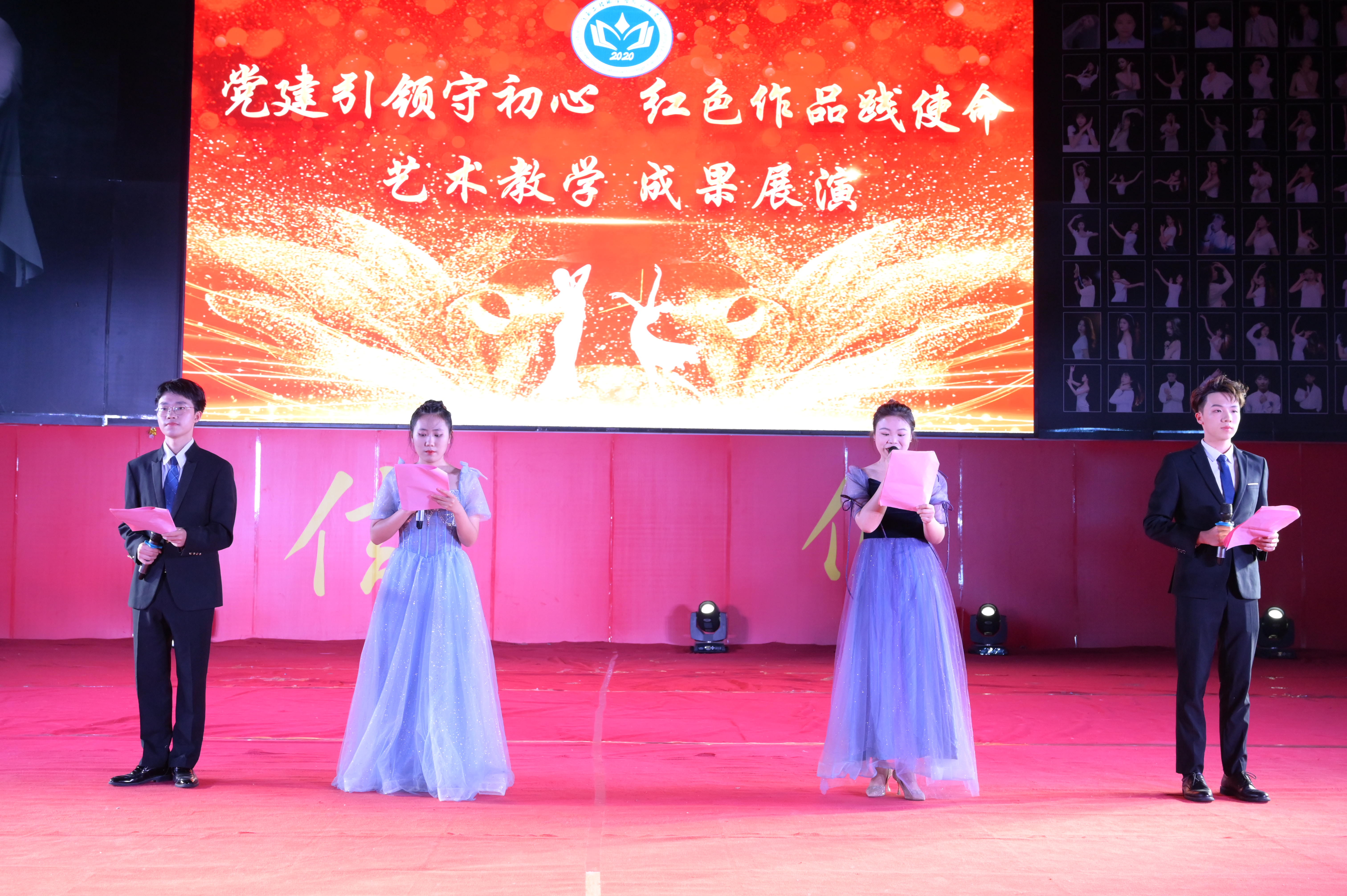 校长助理梁善雅宣布教育学院“党建引领守初心、红色作品践使命”艺术教学成果展演开始。