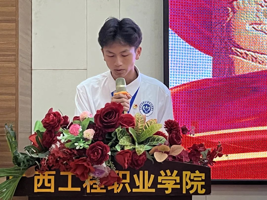 (学生会新一届主席团成员韦冬伟宣读倡议书)