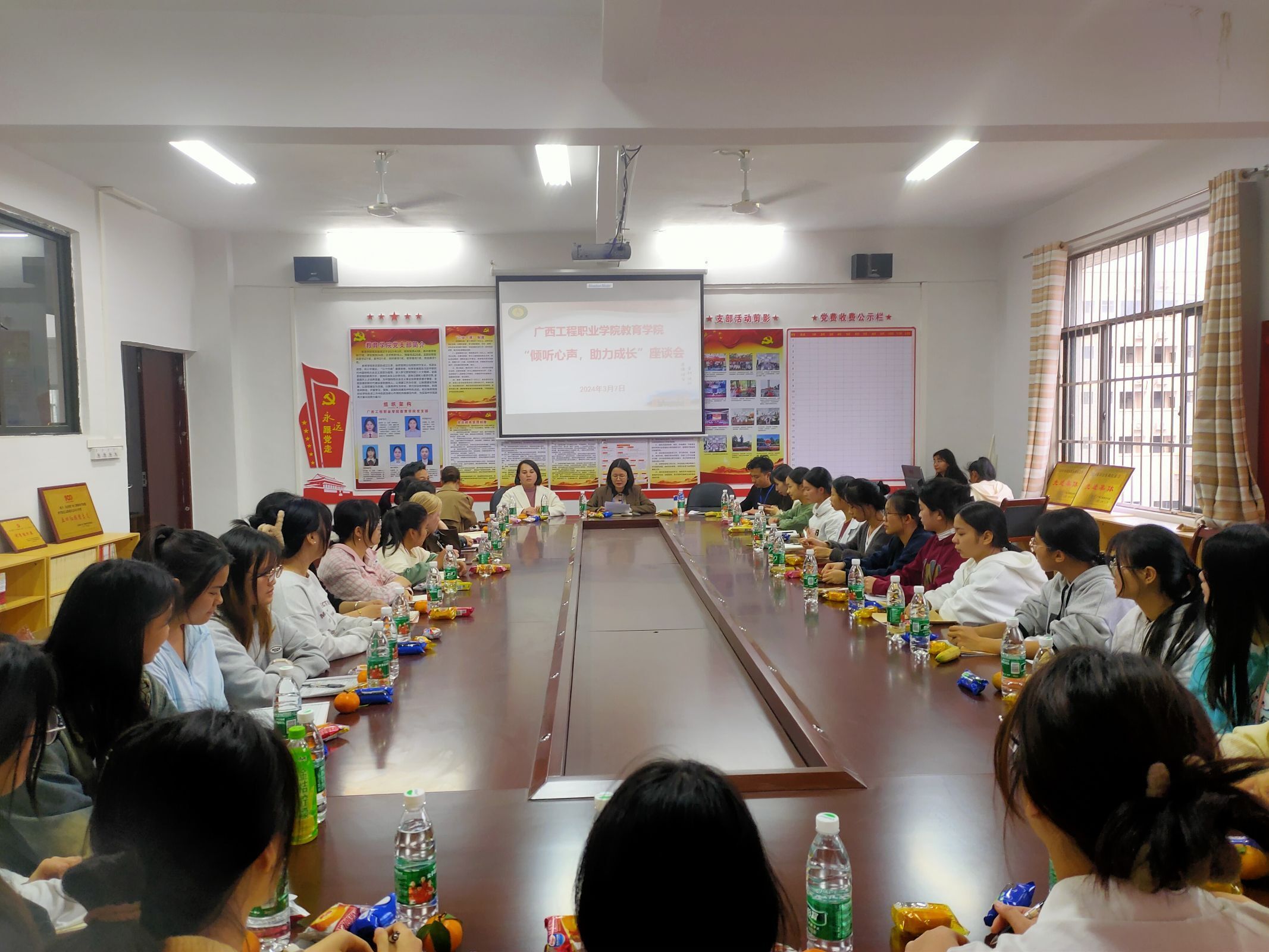 为了全面了解和掌握大学生近期在学习、生活中遇到的问题以及诉求,倾听学生心声,回应并解决学生急难愁盼的问题,深入了解学生需求,共同促进学生全面发展。教育学院党支部于2024年3月7日在教育学院党员活动室601开展“倾听心声,助力成长”主题座谈会。参加座谈会的有教育学院党支部书记、院长梁凤琴、教育学院党支部副书记卢燕梅、教育学院党支部组织委员兼纪律委员叶健芳、教育学院党支部宣传委员吴巧梅、教育学院党支部统战委员王冬、教育学院办公室主任农淑娟、教育学院教研室副主任马熙、教育学院学生代表30人。