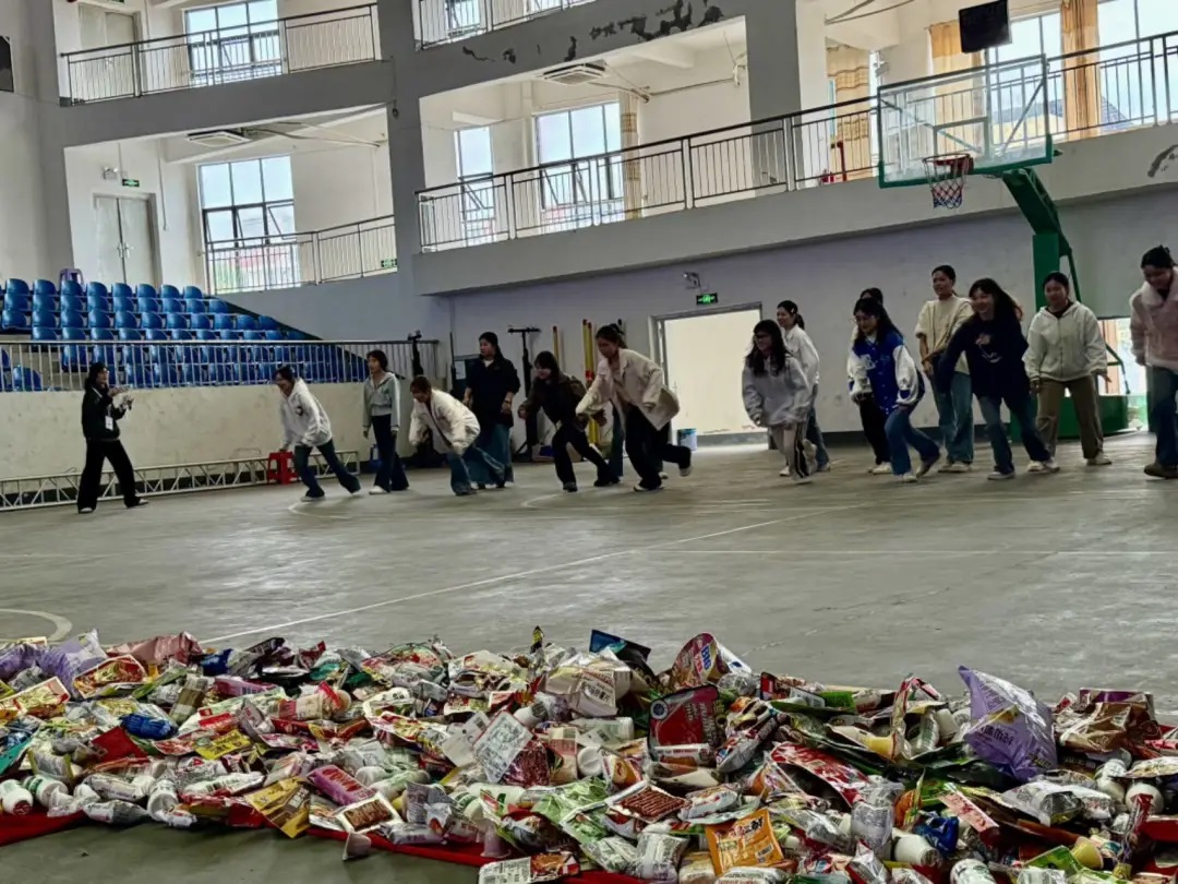 “接力套圈”游戏,每个班派10个人组成一队人,两位选手在起点面对面用自体撑着套圈走到终点从终点以过山洞的方式回到起点、用时最短的前七名获得零食大礼包。