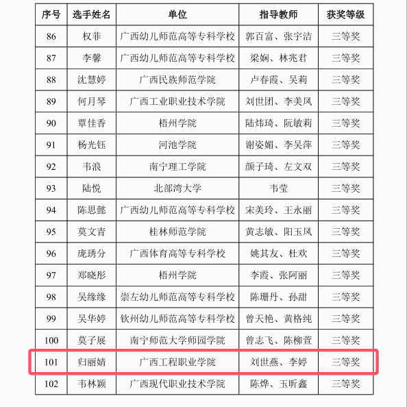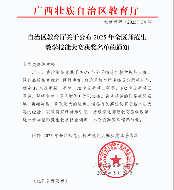 近日,2025 年广西壮族自治区师范生教学技能大赛圆满落幕。我院共派出三名学子, 分别是李婷、刘世燕老师指导的2023级学前教育9班学生归丽婧;覃小密、何瑞祯老师指导的2023级艺术教育4班梁思媛;梁善雅、李婷慧老师指导的2023级艺术教育5班韦烟霞。