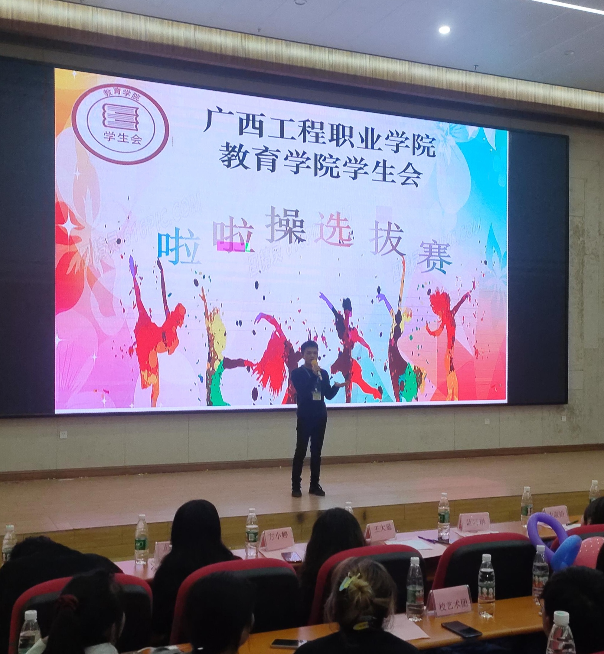 主持人宣读开场白并介绍到场的评委老师:王大冠老师、蓝巧琳老师、莫仟仟老师、农淑娟老师。