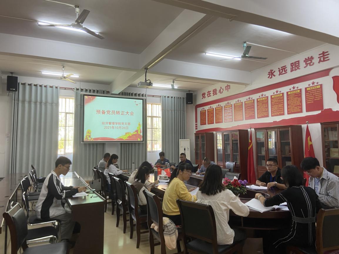 2021年10月26日下午,经济管理学院支部于图书馆一楼党员活动室召开全体党员大会,讨论关于卢冠戎同志的转正问题。会议由支部书记覃清香同志主持。
