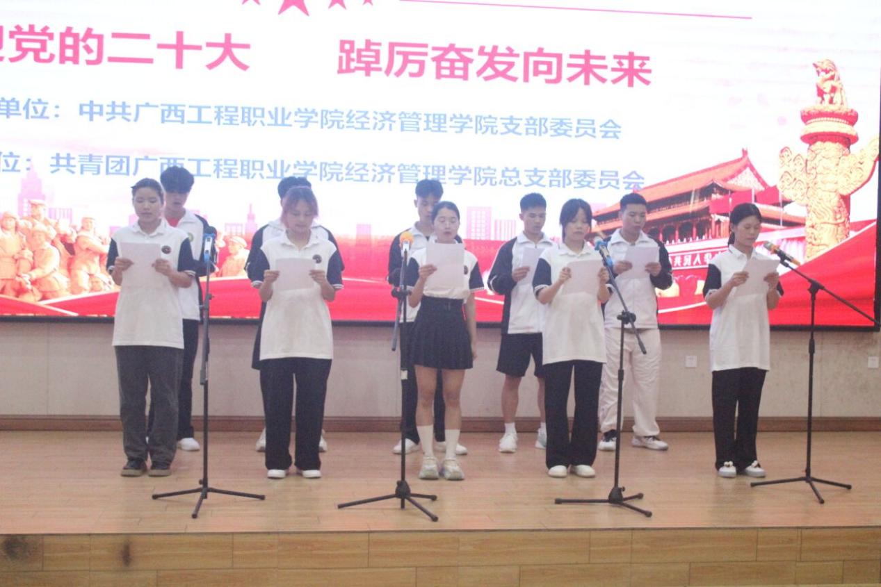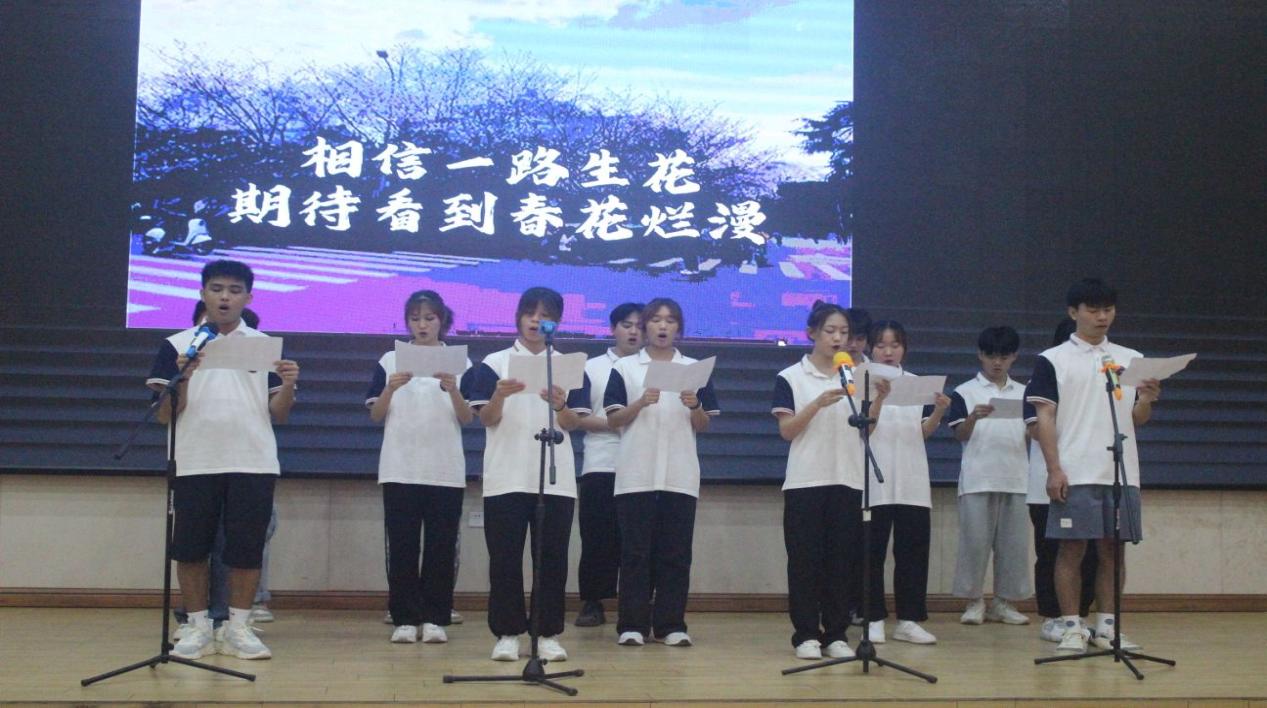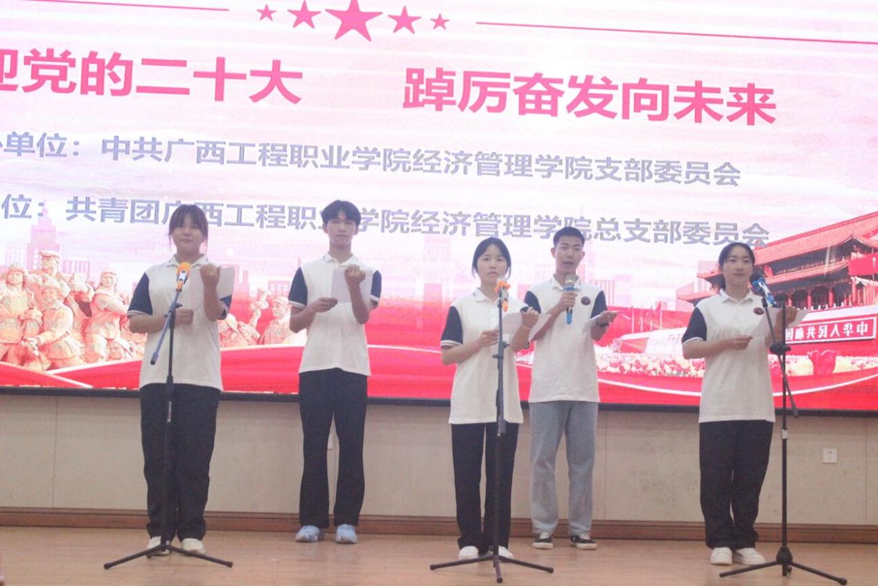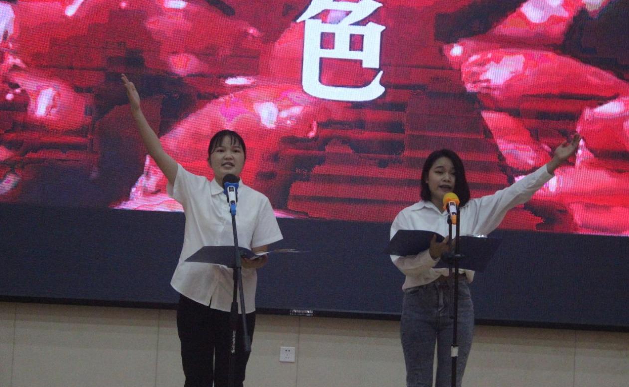 20级酒店2班同学朗诵的《青春》铿锵有力的朗诵声让大家感受到了青春的力量,在台上展现出青春该有的样子。