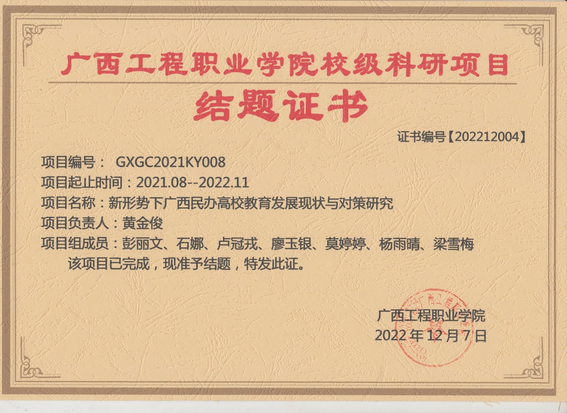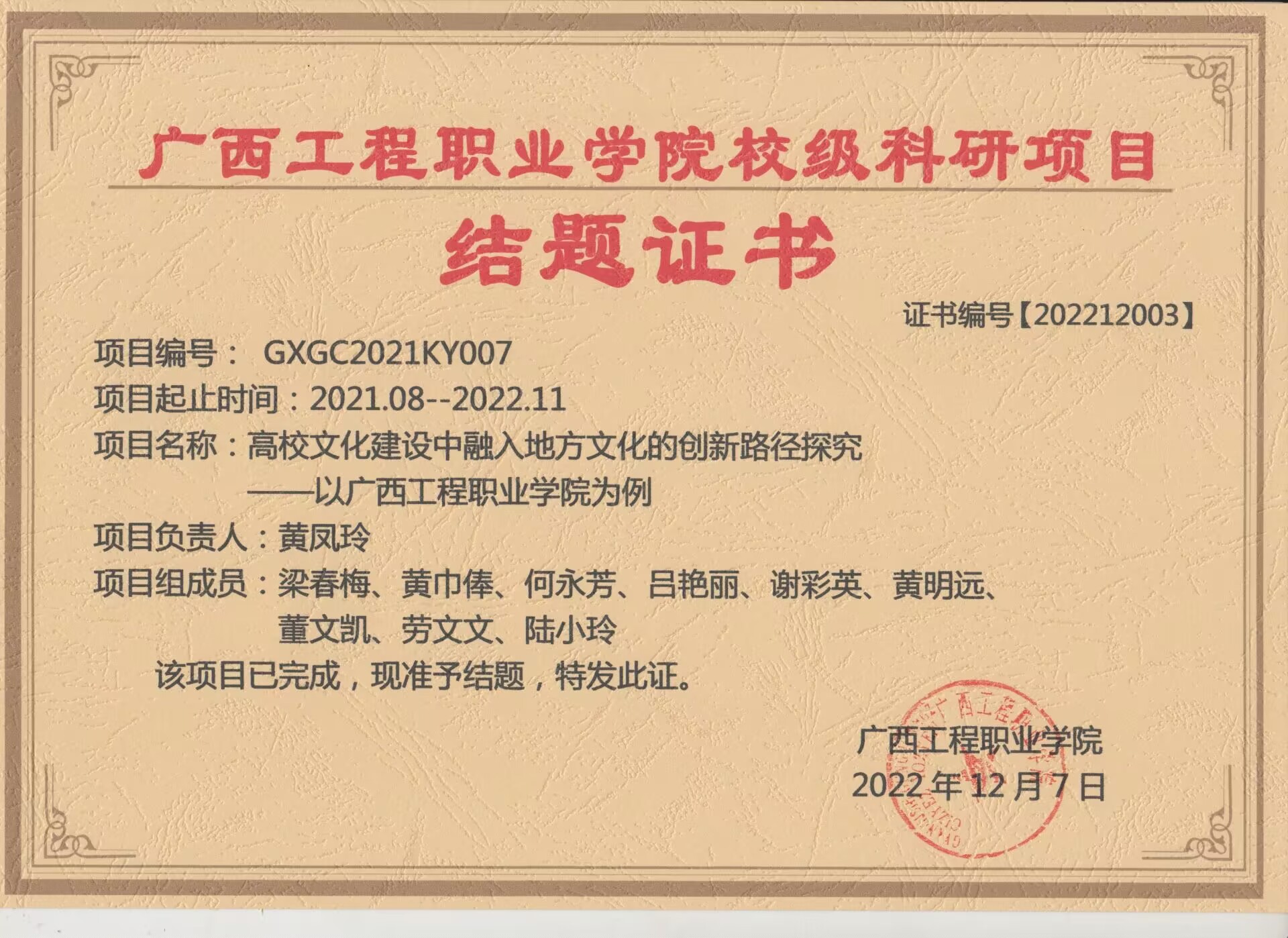 根据《beat365唯一官网关于公布2022年度校级科研项目结题情况的通知》(桂工程院【2022】43号)我院黄凤玲老师主持的《高校文化建设中融入地方文化的创新路径探究——以beat365唯一官网为例》(编号:GXGC2021KY007)、黄金俊老师主持的《新形势下广西民办高校教育发展现状与对策研究》(编号:GXGC2021KY008)通过了学校学术委员会评审,成功结题。