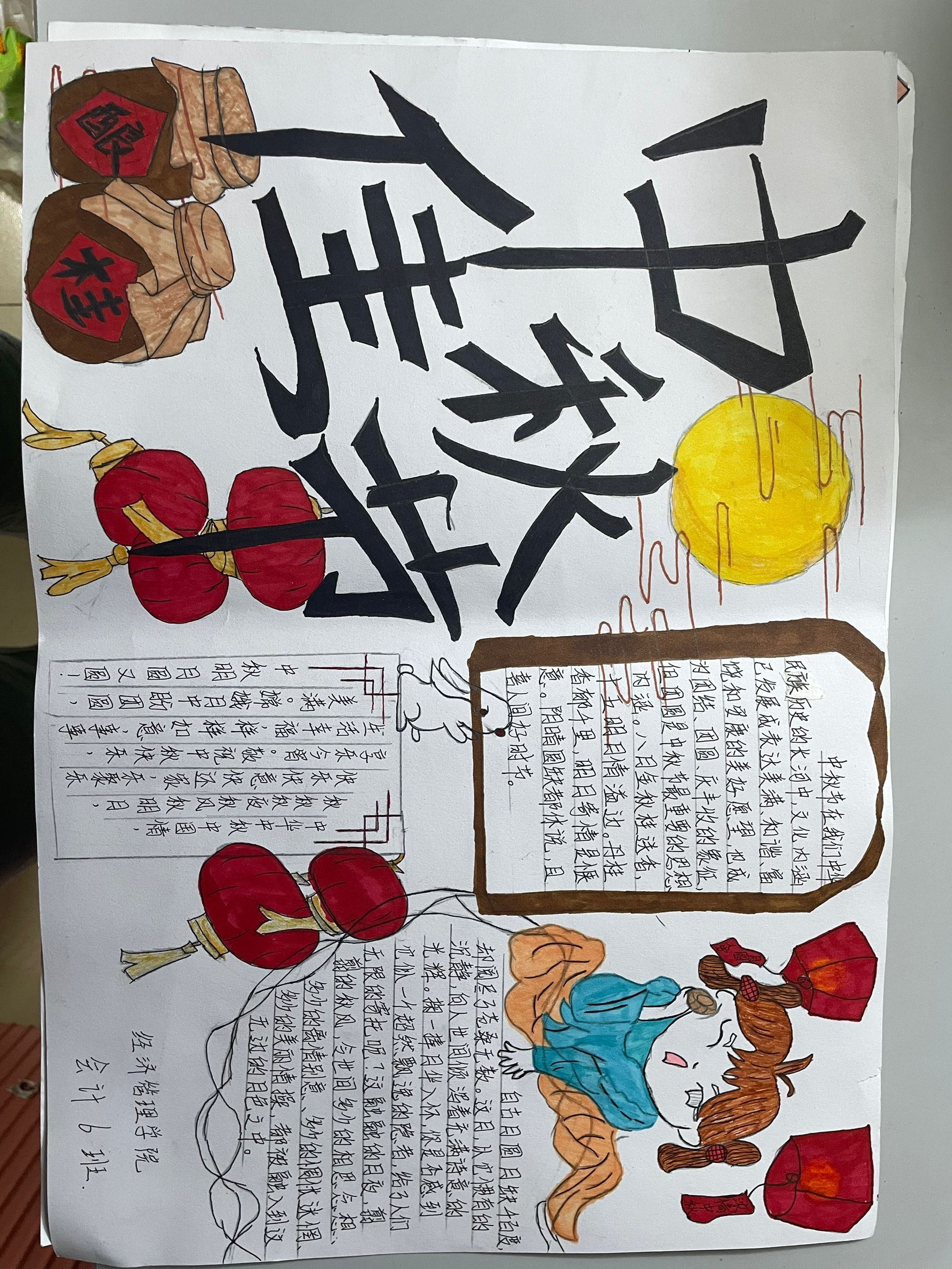 以中秋节为主题的手抄报。用古人诗词鉴赏中秋同学们开展手写祝福活动,通过书写古诗、祝福语,表达对家人的思念和对亲友的祝福,加强对传统文化和节日的了解。开展班会以中秋为主题认识中秋节的由来和通过开展赏花灯猜灯谜活动,让师生感受到传统节日的魅力,增强民族自豪感和文化自信。