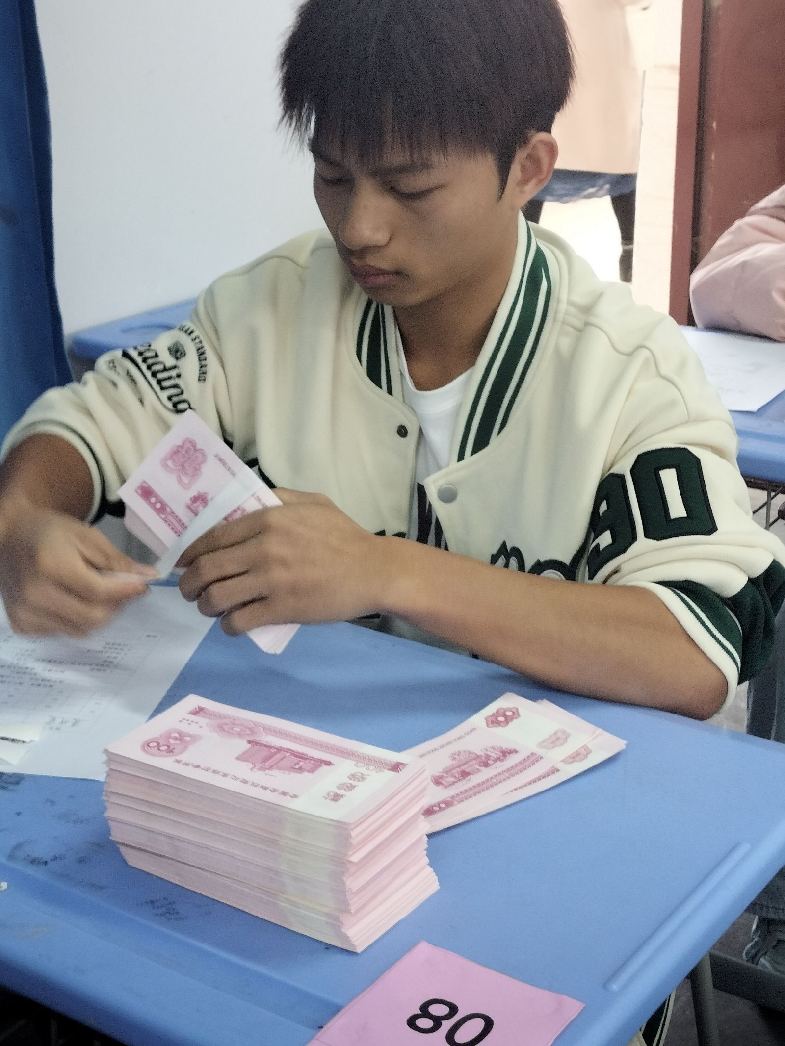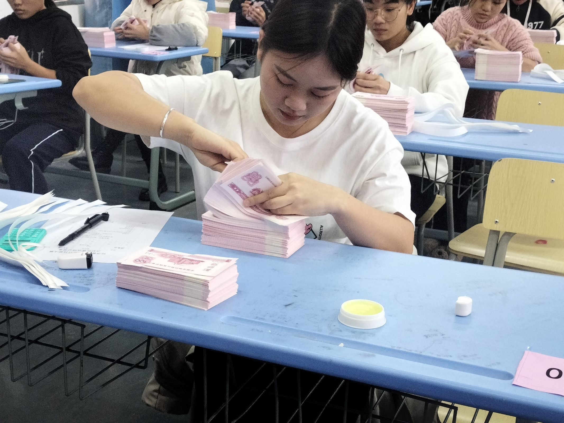 点钞比赛项目中选手们通过拨、滑、挑、摞,电光火石间数十张点钞券于指尖滑落,手指对钞券的攻势愈发猛烈,有三指划出,有五指并用,也有二指游溯,空气在这一刻似乎都凝固了。同学们于指尖和钞券间点燃激情,竞攀速度之巅。