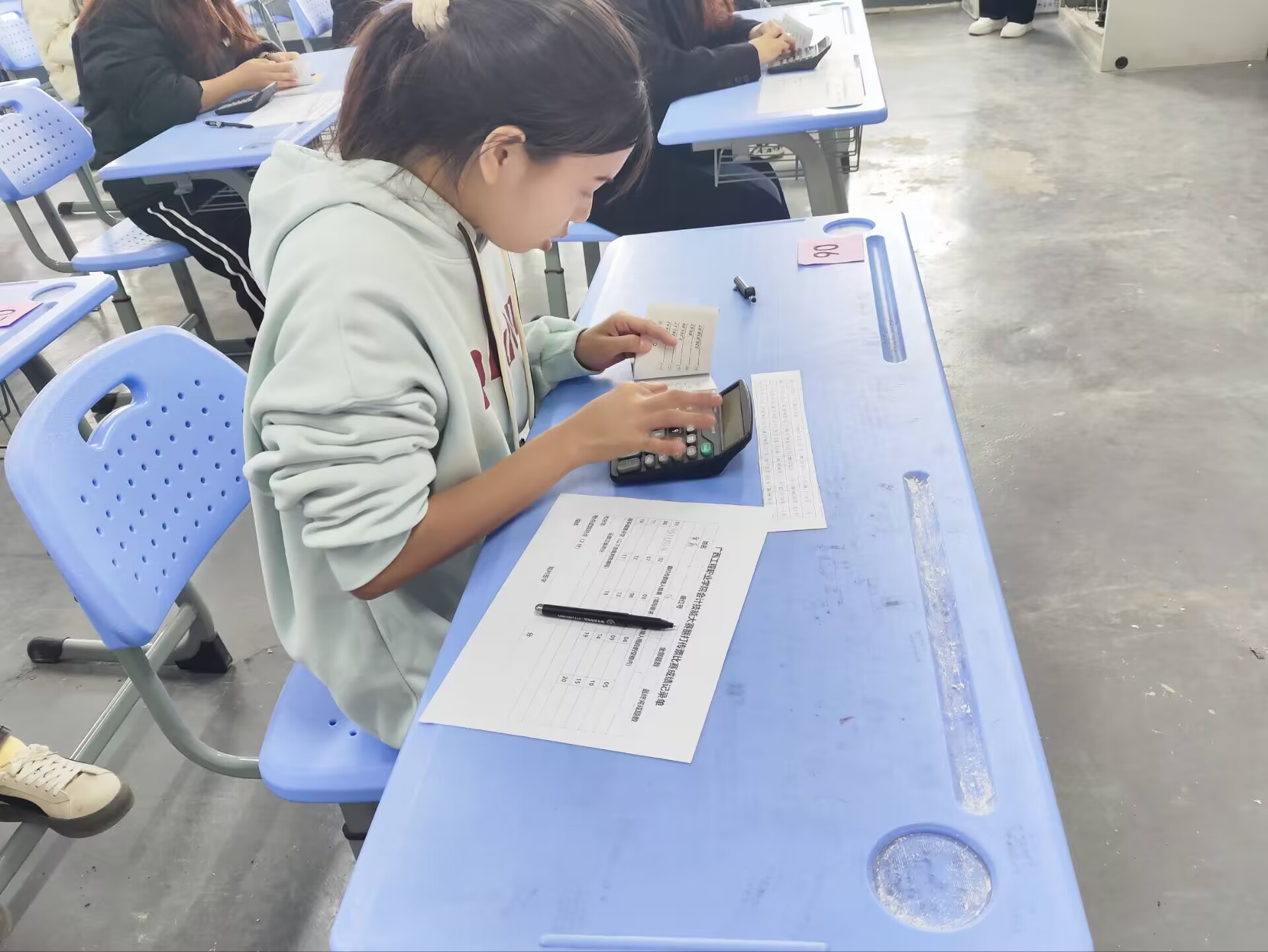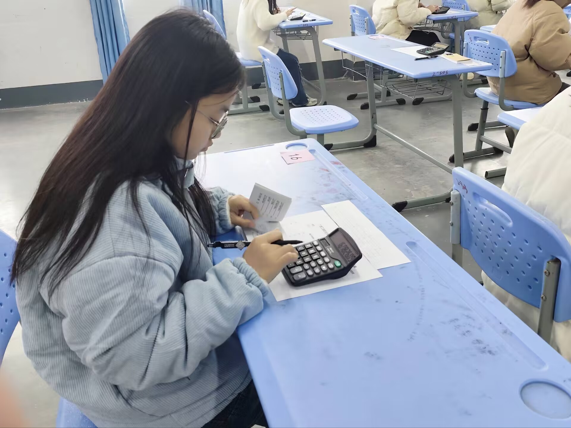翻打传票项目中,随着老师“开始”一声令下,选手们迅速进入比赛状态,每位选手都全神贯注地投入比赛当中,目光在传票和计算器上的数字之间来回扫视,左手娴熟地翻动着传票,右手快速地敲击着键盘上的按键,手指快捷、轻灵地游走在各个数字和符号之间,没有片刻中断。比赛现场呈现出职业竞技中专业而紧张的氛围。敏捷的反应与熟练的指法,展现出财会学子对职业技能日益驾轻就熟、严谨认真的职业态度。