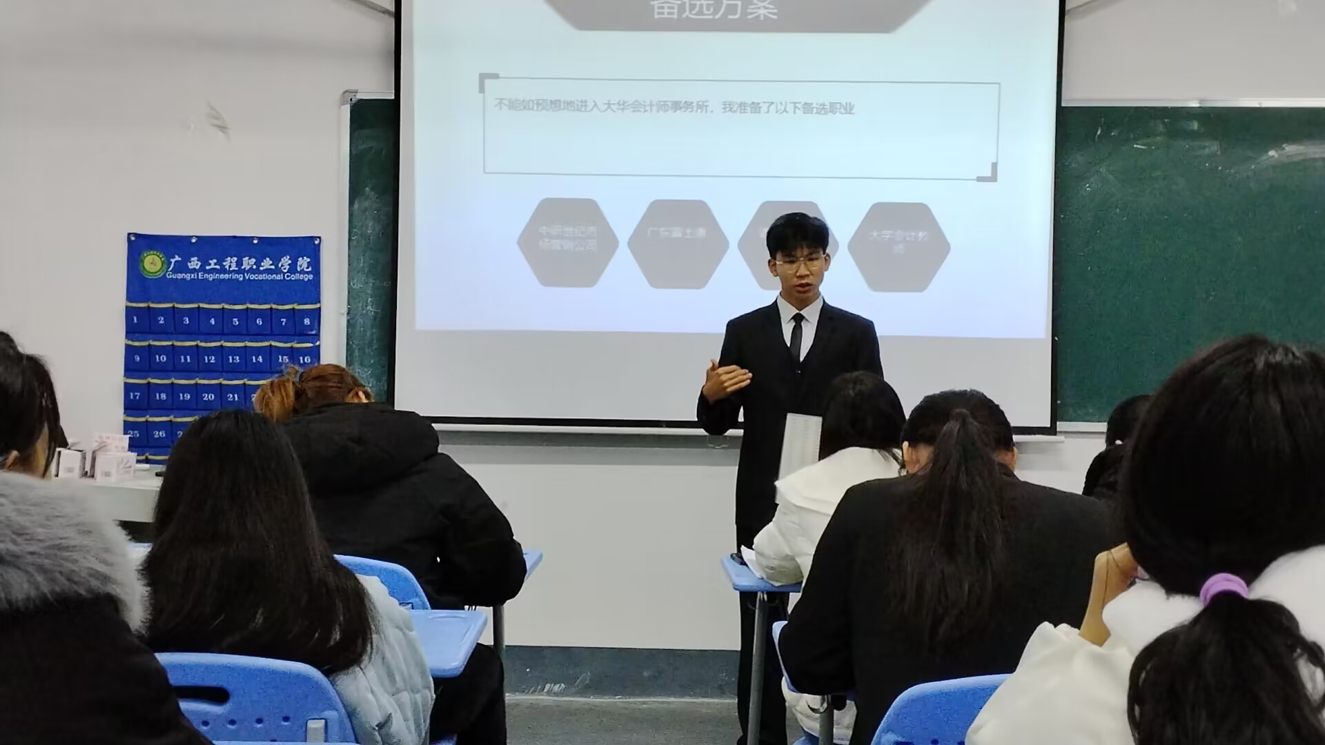 2023年12月21日,经济管理学院在2栋教学楼302、303、304教室举办了首届全国大学生职业规划大赛的初选赛。由潘翠萍、黄雯、潘莹莹、李银、潘金玲、韦爱花、黄月梅、莫瑞玲、梁雪梅等9位老师担任本次比赛的评委,此次初选赛分为两组赛道,分别为成长赛道和就业赛道。