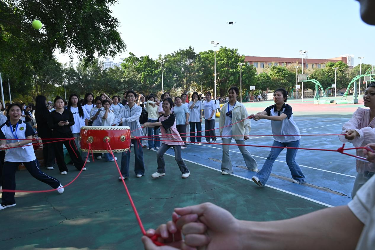 除了旱地龙舟、击鼓传花这两个传统的集体竞赛项目,新增的“好运套圈圈”环节备受欢迎。师生们手持圈圈,站在指定区域,目光专注地瞄准前方摆放的各类精美奖品。有的老师和同学技巧娴熟,轻轻一抛,圈圈便稳稳地套中了心仪的奖品;有的则稍显生疏,但在不断尝试中也逐渐掌握了诀窍。现场不时传来成功套中奖品的欢呼声,大家脸上都洋溢着开心的笑容。套圈圈项目充满了趣味性和互动性,让师生们在游戏中放松身心,享受成功带来的喜悦。