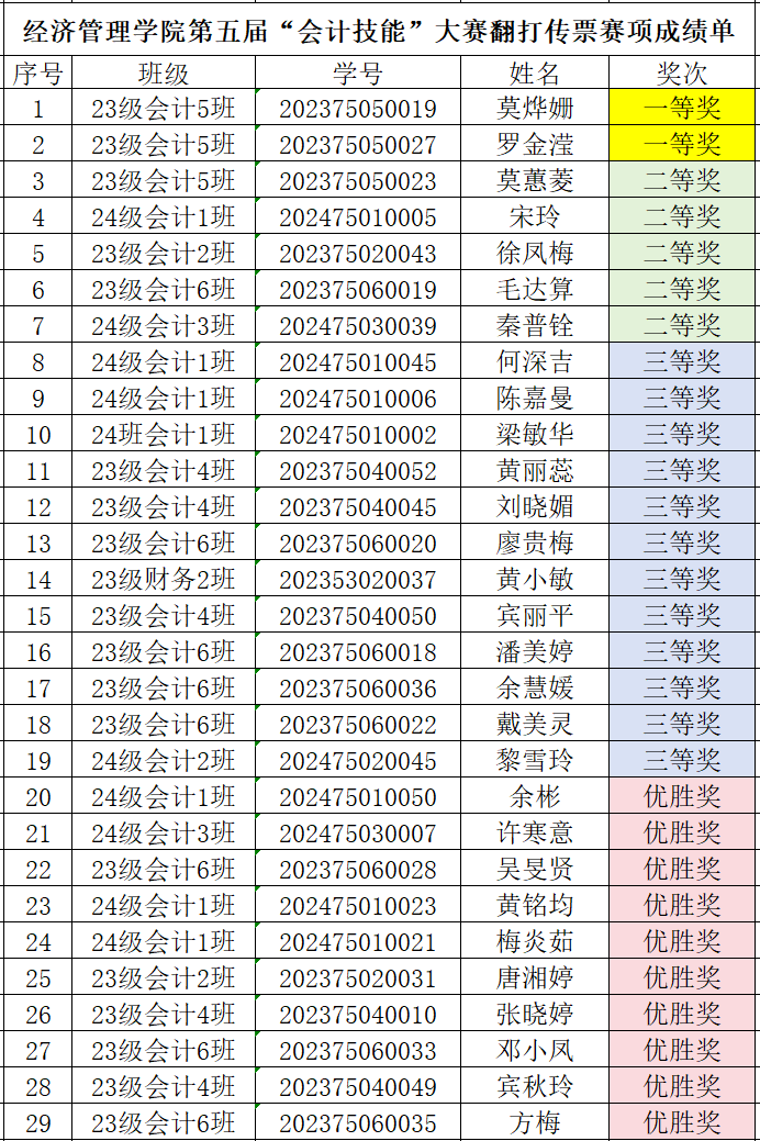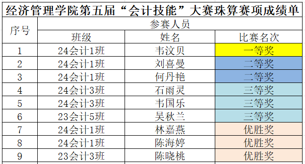 第五届会计技能大赛获奖名单