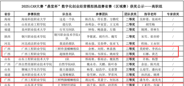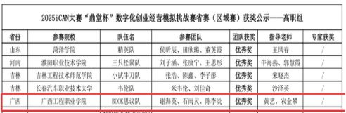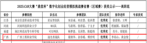 图为2025iCAN 大赛 “鼎堂杯” 数字化创业经营模拟挑战赛省赛(区域赛)获奖情况图片