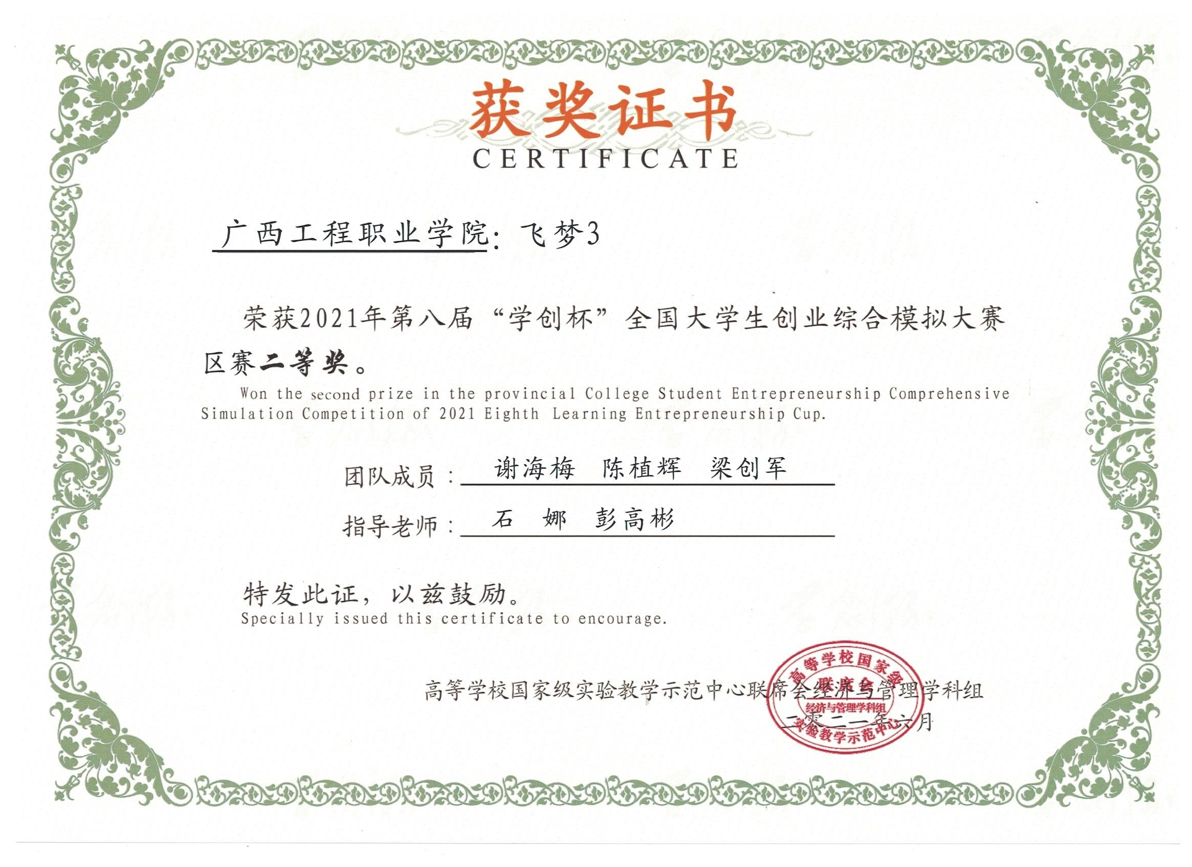 2021年6月5日,2021年第八届“学创杯”全国大学生创新创业综合模拟大赛广西壮族自治区选拔赛在柳州职业技术学院举行,来自全区30余所高校的76支队伍、200多名选手参加了比赛,比赛分本科和高职两组进行,我院学生代表学校参加比赛,3组参赛团队荣获高职组一等奖两项、二等奖一项。