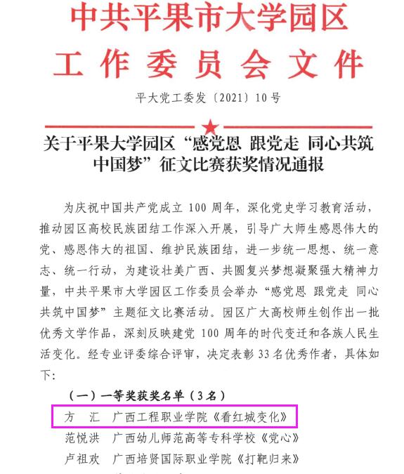 为庆祝中国共产党成立100周年,深化党史学习教育活动,2021年4月由中共平果市大学园区工作委员会举办的“感党恩跟党走同心共筑中国梦”征文比赛,我院2019级物业1班方汇撰写的《红城变化》在众多的参赛选手中脱颖而出,荣获此次征文比赛一等奖,希望广大师生向获奖的同志学习,发挥自己的才智,为学校争取更多的荣誉!