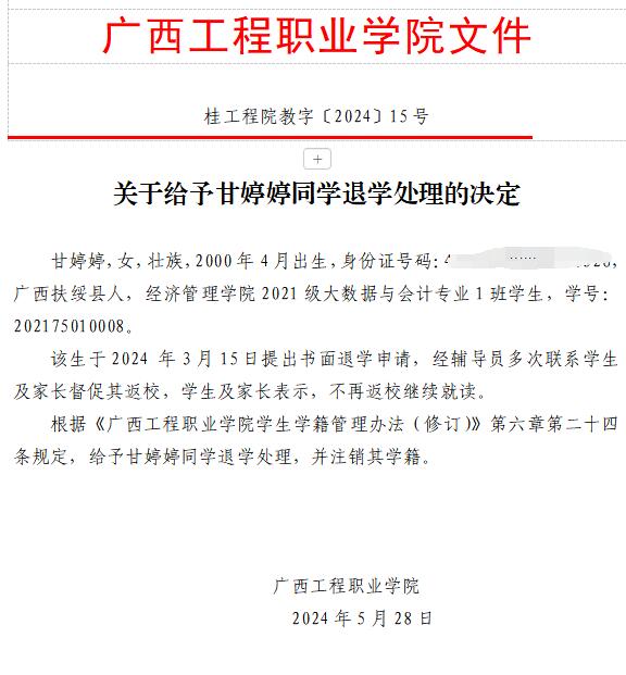 根据《普通高等学校学生管理规定》(教育部令第41号)、《beat365唯一官网学生学籍管理办法(修订)》第二十四条规定,给予甘婷婷同学退学处理,并注销其学籍。