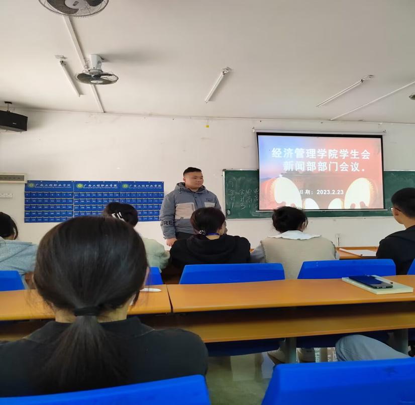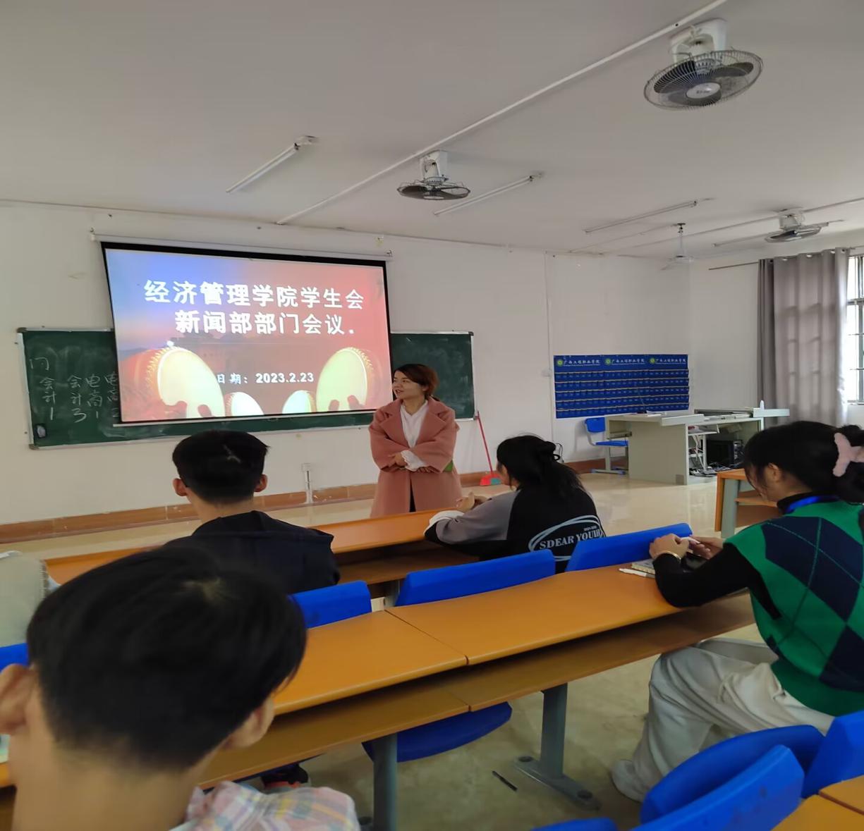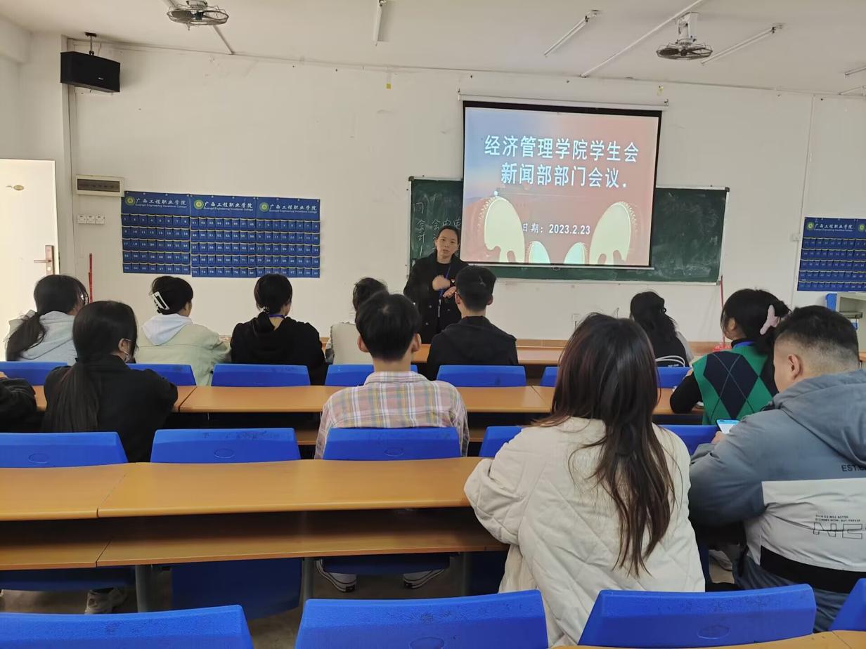 为了更好的提升学生会新闻部的写作能力及宣传水平,2023年2月23日在经济管理学院教学楼102室召开部门会议。参会人员有经济管理学院院长庞英连、学生科科长李东英、办公室主任雷红以及新闻部的干部和干事。