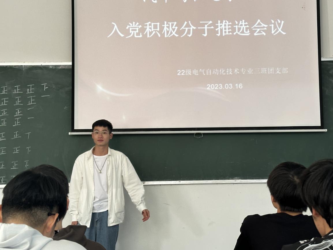 22级模具1班方华侨同学在推选会议上讲解了入党积极分子推优的目的及意义,并宣读《汽车与机电学院入党积极分子推优制度》。